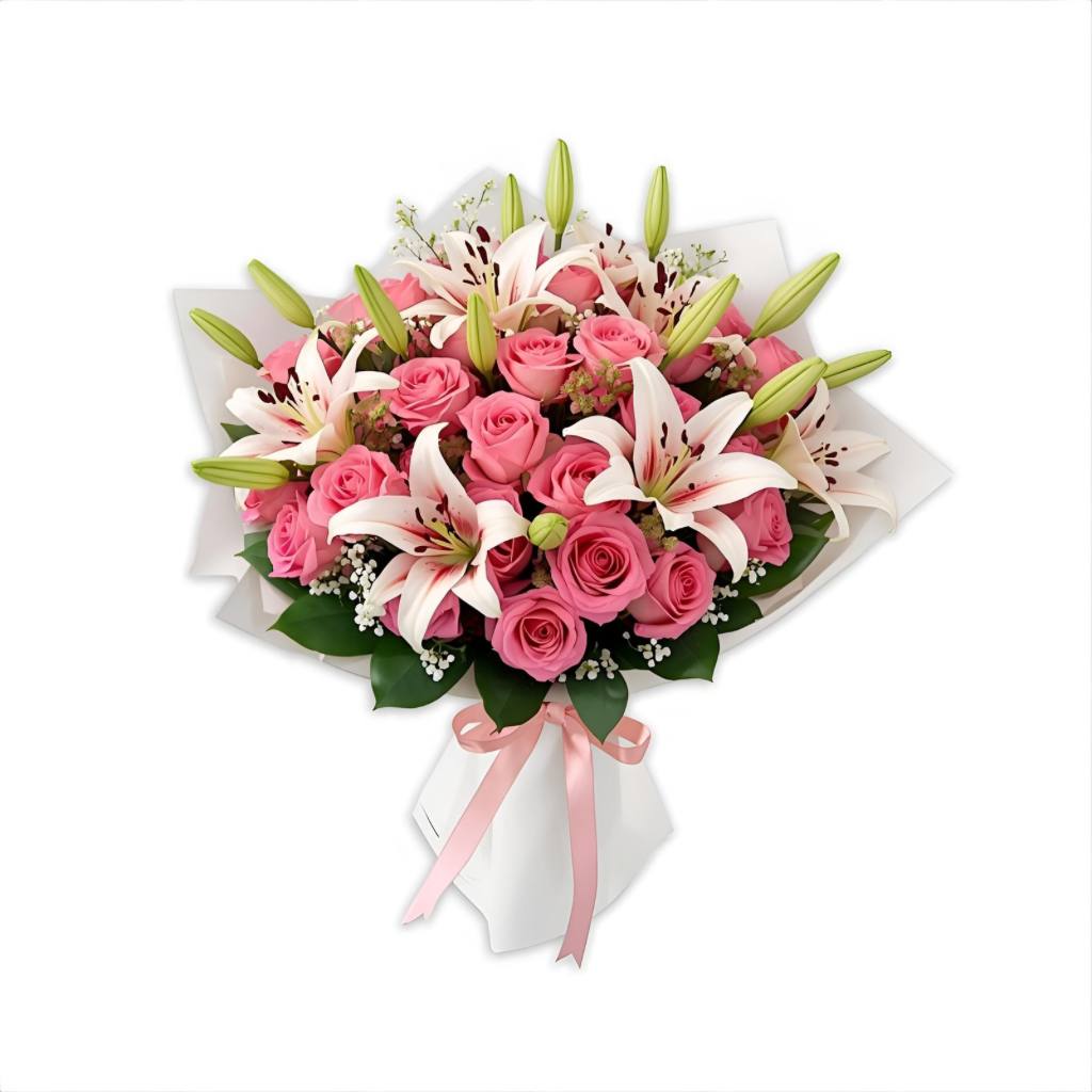 Pembe Gül ve Lilyumlar Buketi, romantizm ile ihtişamın zarif buluşması! Pastel pembe güller ve görkemli lilyumlar, özel anlara duygu dolu bir dokunuş katıyor.